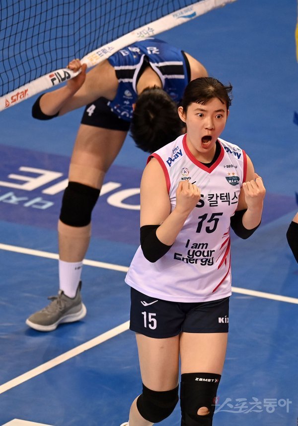 6일 화성종합경기타운 실내체육관에서 열린 ‘2021~2022 도드람 V-리그’ 여자부 IBK기업은행과 GS칼텍스 경기에서 GS칼텍스 문명화가 블로킹 득점에 성공한 후 기뻐하고 있다.