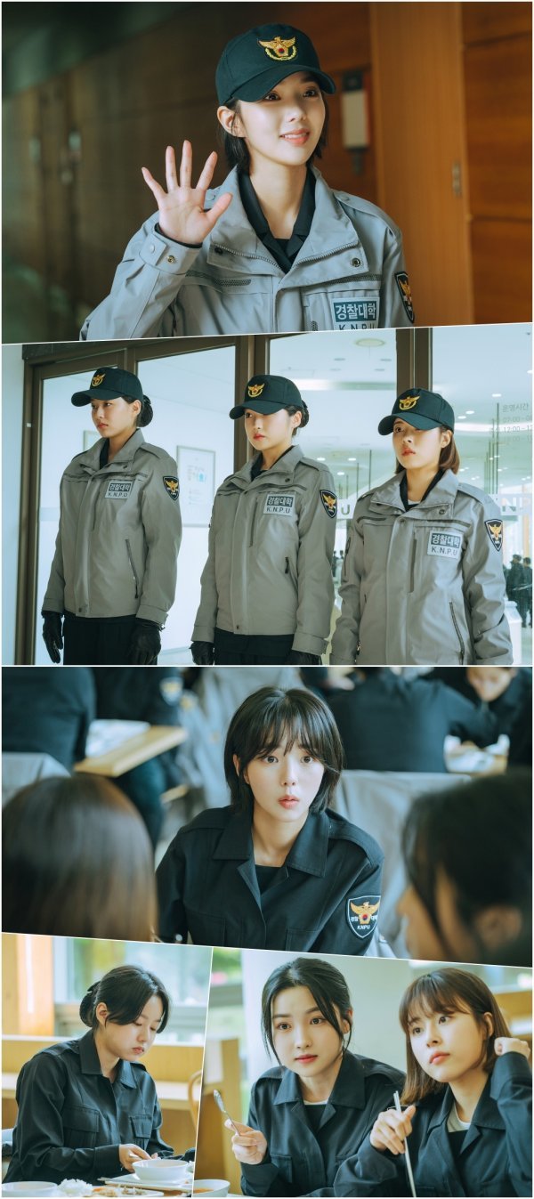 공개된 사진 속 여자 신입생 고은강, 기한나, 우주영, 신아리의 모습이 호기심을 자극한다. 꿈을 향해 한발 내디딘 설렘도 잠시 경찰 대학의 매운맛을 미리 맛본 기한나, 우주영, 신아리는 긴장한 모습이다. 기합이 잔뜩 들어간 동기들과 달리, 추가 합격으로 가까스로 입성한 고은강은 모든 순간이 그저 행복하다. 환한 미소로 인사를 건네는 고은강의 모습에서 그의 비범한 에너지를 엿볼 수 있다. 고은강이 쏟아내는 이야기에 호기심이 발동한 우주영과 신아리부터 그 옆에서 밥 먹기에 열중하는 기한나까지, 달라도 너무 다른 이들의 점심시간도 흥미롭다. 남다른 팀워크로 경찰 대학에서 살아남는 법을 체득해 나갈 청춘들의 다이내믹한 캠퍼스 라이프가 기대를 모은다.