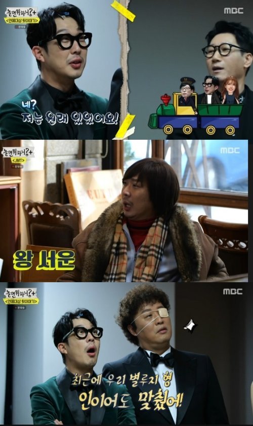 이날 하하는 시상식 전 \'놀면 뭐하니\' 대기실을 찾은 지석진이 미주에 대해 "유재석 열차 타고 제일 뜨는 애"라고 말하자 "형이 지금 타 있는 건데 모르냐"라고 받아쳤다. 그러자 유재석은 하하를 가리키며 "얘는 내가 늘 기관실에서 안고 다니는 애"라고 덧붙이며 웃음을 자아냈다.