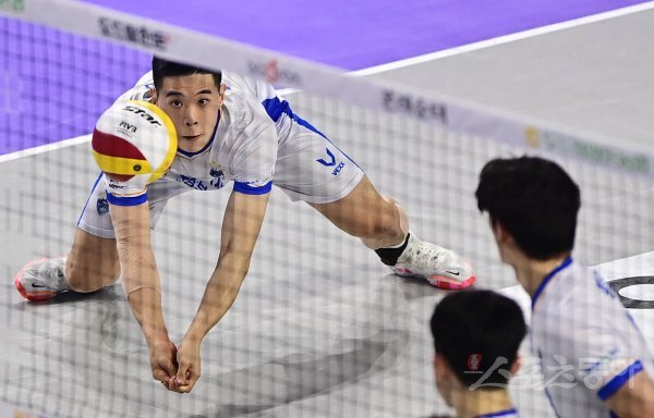 9일 인천 계양체육관에서 열린 ‘2021~2022 도드람 V-리그’ 남자부 인천 대한항공과 대전 삼성화재의 경기에서 삼성화재 황승빈이 디그를 하고 있다.