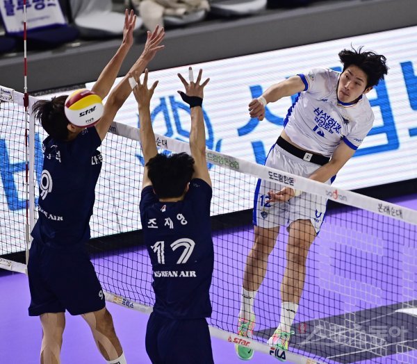 9일 인천 계양체육관에서 열린 ‘2021~2022 도드람 V-리그’ 남자부 인천 대한항공과 대전 삼성화재의 경기에서 삼성화재 황경민이 대한항공 블로커 위로 스파이크를 때리고 있다.