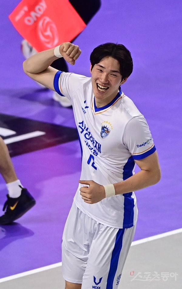 9일 인천 계양체육관에서 열린 ‘2021~2022 도드람 V-리그’ 남자부 인천 대한항공과 대전 삼성화재의 경기에서 삼성화재 황경민이 득점에 성공한 후 기뻐하고 있다.