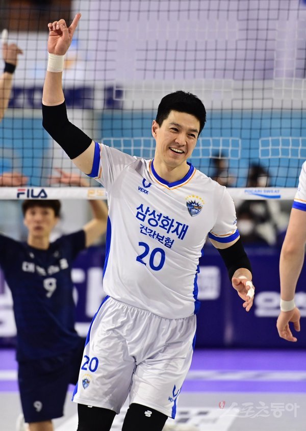 9일 인천 계양체육관에서 열린 ‘2021~2022 도드람 V-리그’ 남자부 인천 대한항공과 대전 삼성화재의 경기에서 삼성화재 한상길이 득점에 성공한 후 세리머니를 하고 있다.