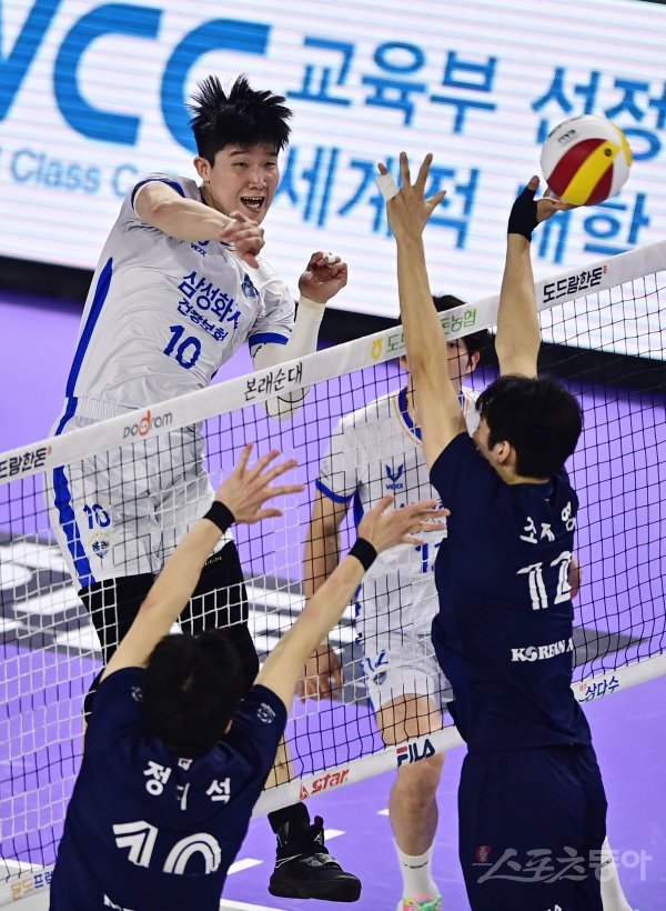 9일 인천 계양체육관에서 열린 ‘2021~2022 도드람 V-리그’ 남자부 인천 대한항공과 대전 삼성화재의 경기에서 삼성화재 안우재가 대한항공 블로커 위로 스파이크를 때리고 있다.