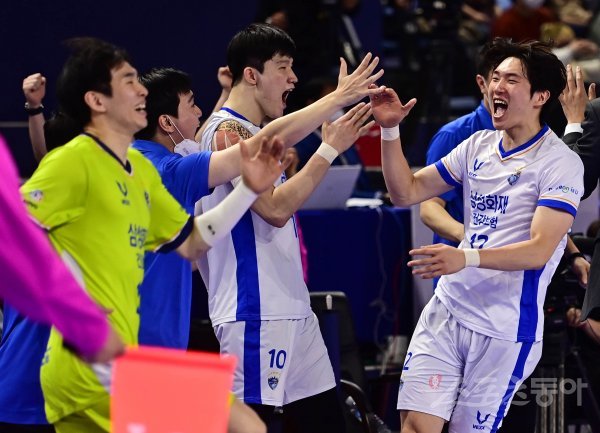 9일 인천 계양체육관에서 열린 ‘2021~2022 도드람 V-리그’ 남자부 인천 대한항공과 대전 삼성화재의 경기에서 대한항공에 세트스코어 3-2로 승리를 거둔 삼성화재 황경민이 동료들과 기쁨을 나누고 있다.