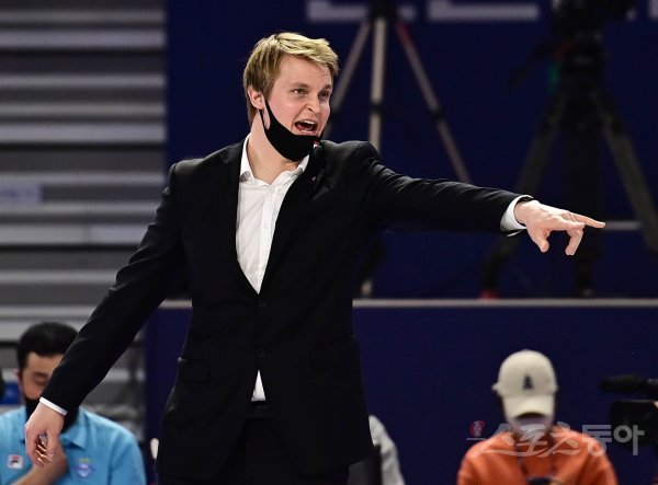 9일 인천 계양체육관에서 열린 ‘2021~2022 도드람 V-리그’ 남자부 인천 대한항공과 대전 삼성화재의 경기에서 대한항공 토미 틸리카이넨 감독이 선수들에게 작전 지시를 하고 있다.