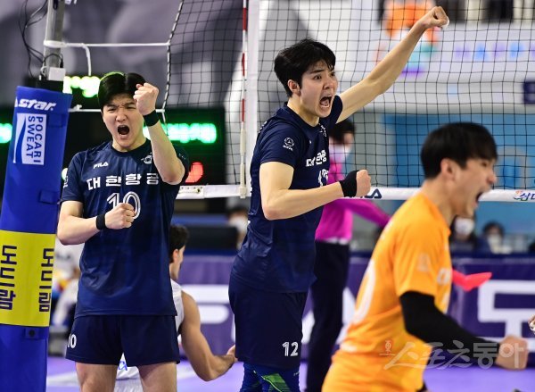 9일 인천 계양체육관에서 열린 ‘2021~2022 도드람 V-리그’ 남자부 인천 대한항공과 대전 삼성화재의 경기에서 대한항공 정지석과 조재영이 블로킹 득점에 성공한 후 환호하고 있다.