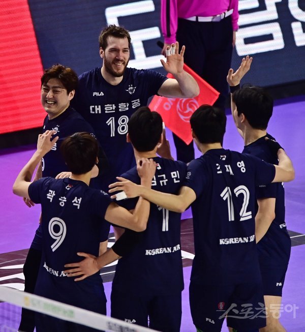 9일 인천 계양체육관에서 열린 ‘2021~2022 도드람 V-리그’ 남자부 인천 대한항공과 대전 삼성화재의 경기에서 대한항공 링컨이 득점에 성공한 후 동료들과 기쁨을 나누고 있다.
