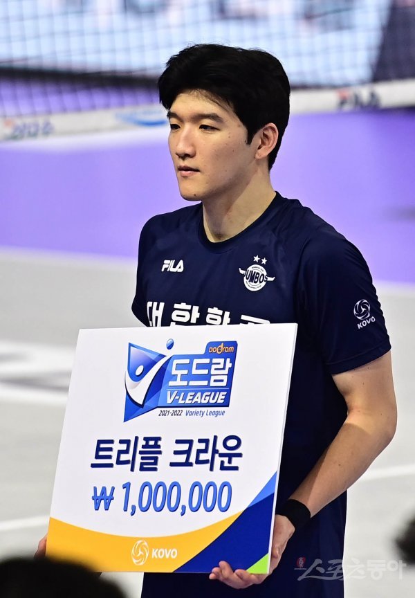 9일 인천 계양체육관에서 열린 ‘2021~2022 도드람 V-리그’ 남자부 인천 대한항공과 대전 삼성화재의 경기에서 대한항공 정지석이 트리플 크라운 달성 기념 시상식에서 포즈를 취하고 있다.