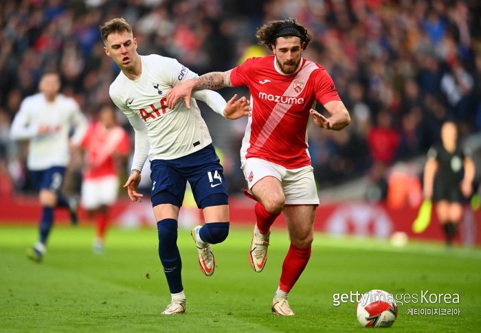 모어캠의 콜 스톡턴이 2022년 1월 9일 영국 런던의 토트넘 홋스퍼 스타디움에서 열린 에미레이트 FA컵 3라운드 토트넘 홋스퍼와의 경기에서 토트넘 홋스퍼의 조 로던과 공을 다투고 있다.