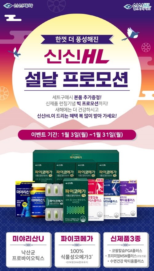 신신제약은 건강관리 전문 브랜드 신신HL의 설날 프로모션을 진행한다. 대상 제품은 프리미엄 식물성 오메가-3 ‘파이코메가’, 낙산균 프로바이오틱스 ‘미야리산U’, 2022년 새로 출시한 관절 및 연골 건강을 위한 ‘프리미엄MSM플러스’, 뼈 건강을 위한 ‘코랄칼슘PGA플러스’, 수면 건강을 위한 ‘수면건강락티움플러스’ 등 5종이다.