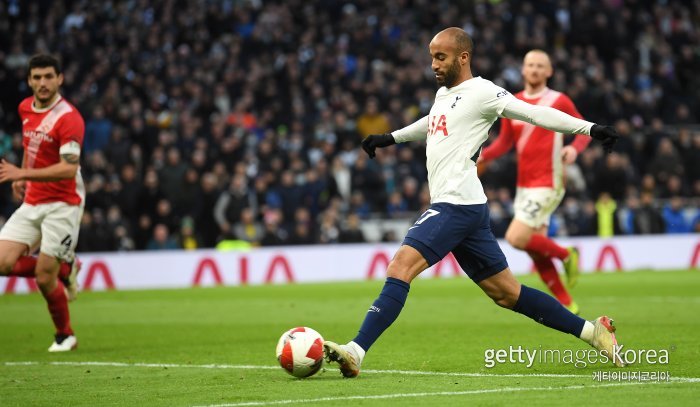 토트넘 홋스퍼의 루카스 모우라가 2022년 1월 9일 영국 런던의 토트넘 홋스퍼 스타디움에서 열린 에미레이트 FA컵 3라운드 모어캠과의 경기에서 팀의 두 번째 골을 넣고 있다.