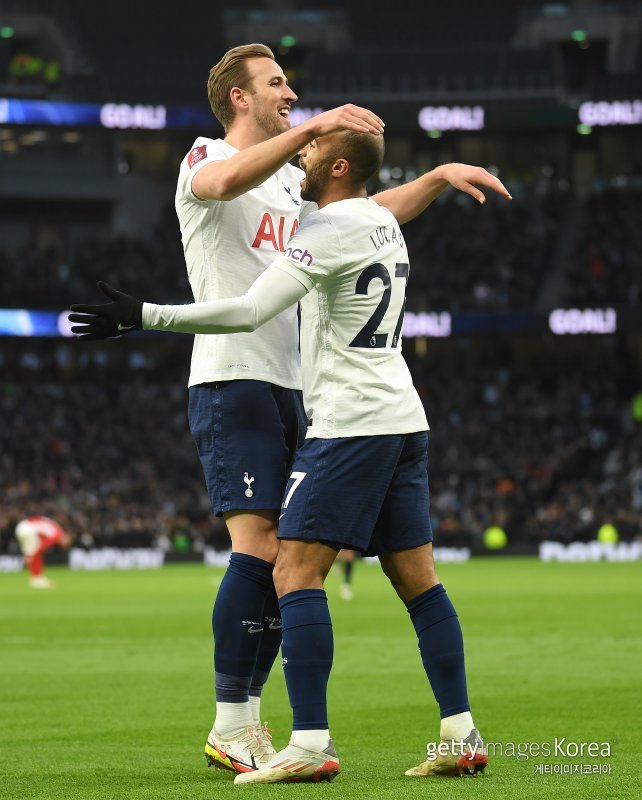 토트넘 홋스퍼의 루카스 모우라가 2022년 1월 9일 영국 런던의 토트넘 홋스퍼 스타디움에서 열린 에미레이트 FA컵 3라운드 모어캠과 경기에서 팀의 두 번째 골을 넣은 뒤 동료 해리 케인과 함께 축하하고 있다.