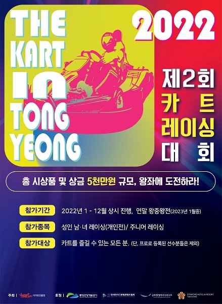 더카트인통영의 ‘2022년 제2회 카트 레이싱 대회’는 1월부터 12월까지 상시 개최되며, 매월 1위부터 3위까지 입상자에게는 시상품과 왕중왕전 대회 참가 기회를 제공한다. 왕중왕전은 내년 1월 열릴 예정이다.
