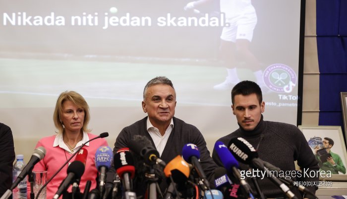 노박 조코비치의 가족이 2022년 1월 10일 세르비아 베오그라드에서 기자회견을 하고 있다. 노박 조코비치는 연방순회법원의 명령으로 멜버른에 있는 호텔에서 풀려날 예정이다. 테니스 세계 랭킹 1위인 그는 호주 입국 후 비자가 취소된 후 호텔에 머물고 있었다.