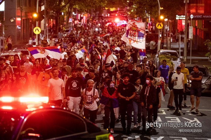 세르비아 테니스 팬들이 2022년 1월 10일 호주 멜버른에서 콜린스 거리를 따라 행진하고 있습니다. 조코비치는 지난주 호주로 입국한 뒤 비자가 취소돼 멜버른에 있는 호텔에 억류돼 있다. 조코비치는 오늘 연방 가족과 연방법원에서 심리될 이 결정에 대해 법원에 이의를 제기했습니다. 조코비치는 오는 17일 개막하는 호주오픈에 출전하기 위해 호주에 입국했습니다.