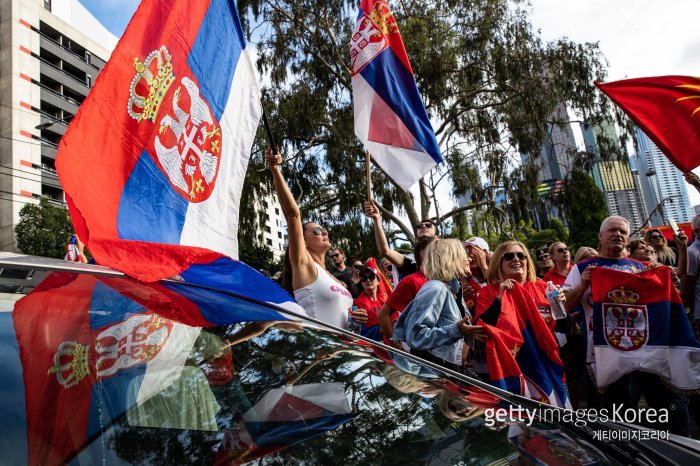세르비아 테니스 팬들과 백신 접종 반대 시위대가 2022년 1월 8일 호주 멜버른 파크 호텔 밖에서 집회를 열고 있다. 조코비치는 이번 호주오픈에 출전하기 위해 멜버른에 도착했지만 호주 진출 요건을 충족하지 못해 호주 입국이 거부됐다. 조코비치는 호주 멜버른의 한 호텔에 억류돼 있다.
