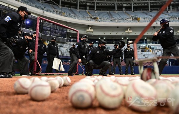 KBO 사무국 산하 심판위원회에 속한 1, 2군 심판들이 11일 서울 고척스카이돔에서 스트라이크존 적응 훈련을 하고 있다.