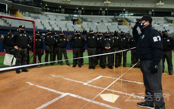 KBO 사무국 산하 심판위원회에 속한 1, 2군 심판들이 11일 서울 고척스카이돔에서 스트라이크존 적응 훈련을 하고 있다. 최수원 심판이 동료 심판들에게 이야기를 하고 있다.