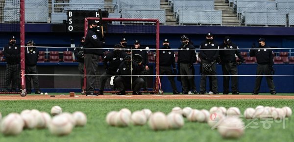 KBO 사무국 산하 심판위원회에 속한 1, 2군 심판들이 11일 서울 고척스카이돔에서 스트라이크존 적응 훈련을 하고 있다.