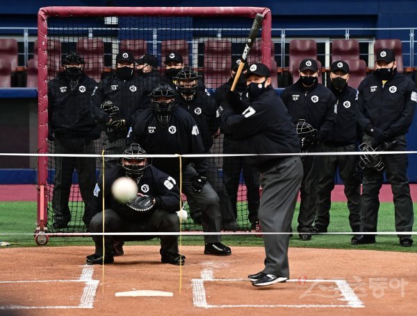 KBO 사무국 산하 심판위원회에 속한 1, 2군 심판들이 11일 서울 고척스카이돔에서 스트라이크존 적응 훈련을 하고 있다. 고척 | 주현희 기자 teth1147@donga.com