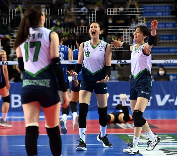 11일 화성종합경기타운 실내체육관에서 열린 ‘2021~2022 도드람 V-리그’ 여자부 IBK기업은행과 현대건설 경기에서 4세트 현대건설 이다현이 승리를 결정짓는 블로킹 득점에 성공한 후 기뻐하고 있다.