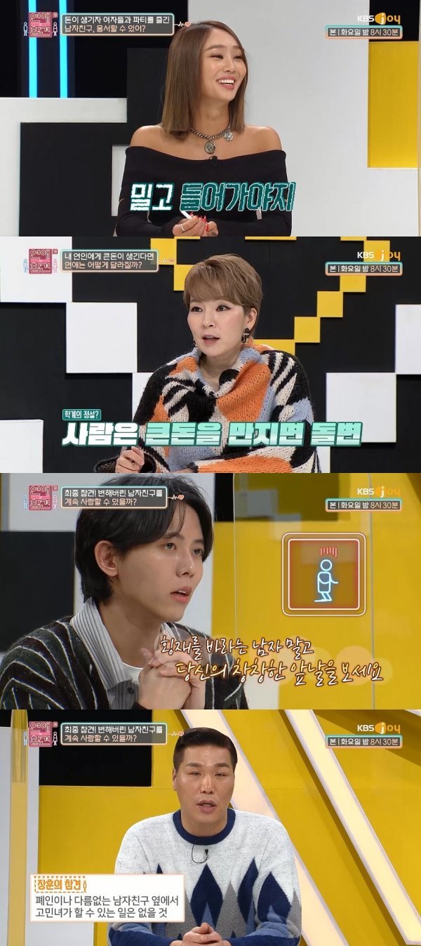 마지막으로 서장훈은 "세상에서 가장 어려운 거가 다운그레이드다. 고민녀는 예전처럼 남자친구가 짠돌이로 돌아갔으면 좋겠다고 생각하지만 이건 불가능하다. 폐인이 된 남자친구 옆에서 고민녀가 할 수 있는 건 아무 것도 없다"라고 덧붙였다.