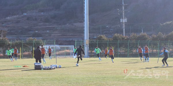 대구FC 선수들이 11일 동계전훈지 경남 남해의 상주한려해상체육공원에서 강도 높은 풀 트레이닝을 소화하고 있다. 남해 | 남장현 기자