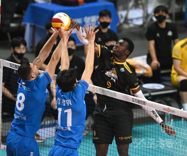 12일 서울 장충체육관에서 열린 ‘2021~2022 도드람 V-리그’ 남자부 우리카드와 KB손해보험 경기에서 KB손해보험 케이타가 우리카드의 블로킹 사이로 밀어넣기 공격을 있다.