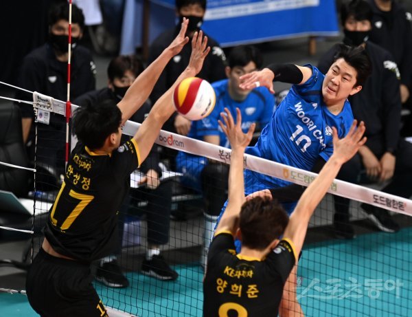 12일 서울 장충체육관에서 열린 ‘2021~2022 도드람 V-리그’ 남자부 우리카드와 KB손해보험 경기에서 우리카드 나경복이 KB손해보험의 블로킹 사이로 스파이크를 날리고 있다.