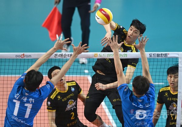12일 서울 장충체육관에서 열린 ‘2021~2022 도드람 V-리그’ 남자부 우리카드와 KB손해보험 경기에서 KB손해보험 박진우가 우리카드의 블로킹 사이로 스파이크를 날리고 있다.