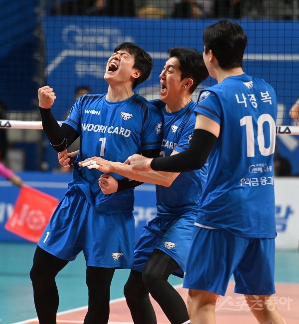 12일 서울 장충체육관에서 열린 ‘2021~2022 도드람 V-리그’ 남자부 우리카드와 KB손해보험 경기에서 우리카드 송희채가 공격 득점에 성공한 후 김재휘와 기뻐하고 있다.