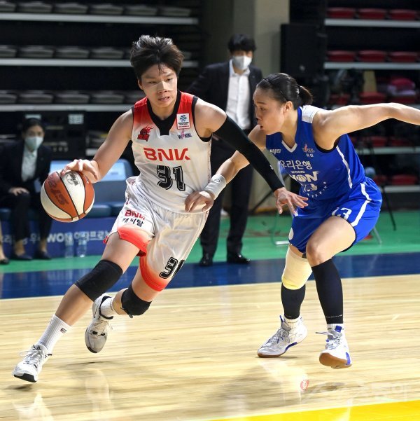 13일 아산 이순신체육관에서 열린 ‘삼성생명 2021~22 여자프로농구’ 우리은행과 BNK 썸 경기에서 BNK 썸 진안이 우리은행의 수비를 뚫고 골밑을 공격하고 있다.