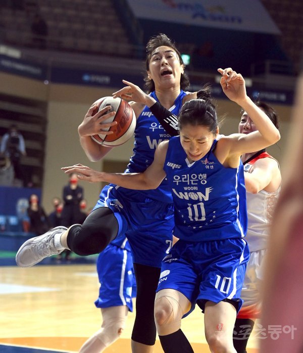 13일 아산 이순신체육관에서 열린 ‘삼성생명 2021~22 여자프로농구’ 우리은행과 BNK 썸 경기에서 우리카드 김소니아가 리바운드 볼을 잡고 있다.