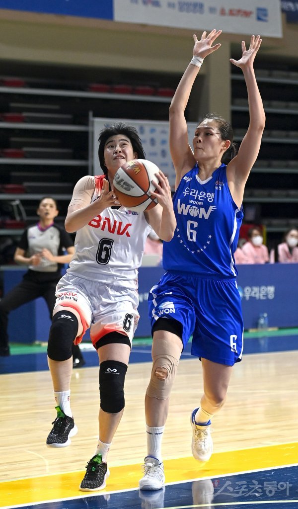 13일 아산 이순신체육관에서 열린 ‘삼성생명 2021~22 여자프로농구’ 우리은행과 BNK 썸 경기에서 BNK 썸 이소희가 우리은행 최이샘의 수비를 뚫고 골밑을 공격하고 있다.