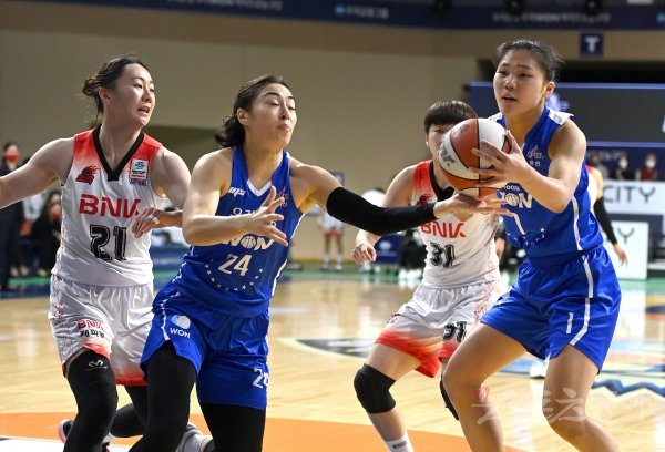 13일 아산 이순신체육관에서 열린 ‘삼성생명 2021~22 여자프로농구’ 우리은행과 BNK 썸 경기에서 우리은행 박지현이 리바운드 볼을 잡고 있다.