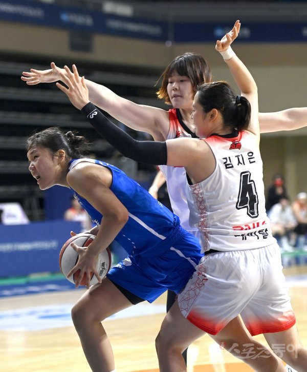13일 아산 이순신체육관에서 열린 ‘삼성생명 2021~22 여자프로농구’ 우리은행과 BNK 썸 경기에서 우리카드 박지현이 BNK 썸의 수비를 뚫고 골밑을 공격하고 있다.