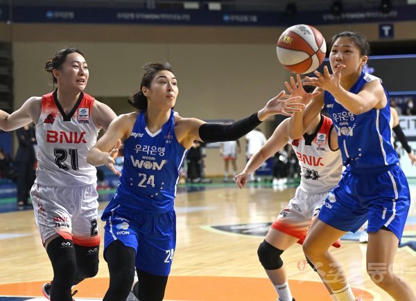 13일 아산 이순신체육관에서 열린 ‘삼성생명 2021~22 여자프로농구’ 우리은행과 BNK 썸 경기에서 우리카드 김소니아와 박지현이 리바운드 볼을 잡고 있다.