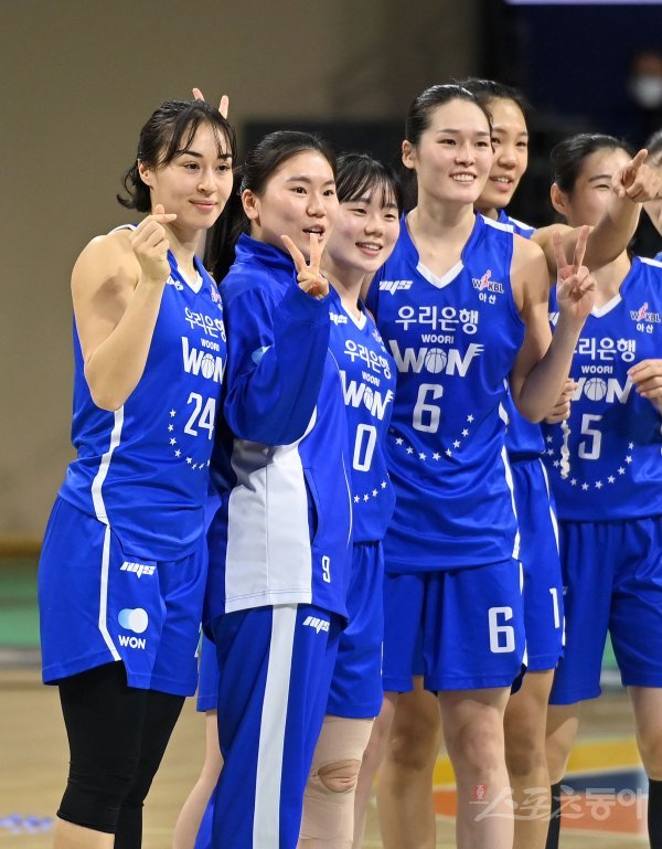 13일 아산 이순신체육관에서 열린 ‘삼성생명 2021~22 여자프로농구’ 우리은행과 BNK 썸 경기에서 우리카드가 78-59 승리를 거두며 2연패에서 탈출했다. 김소니아와 선수들이 기념촬영을 하고 있다.