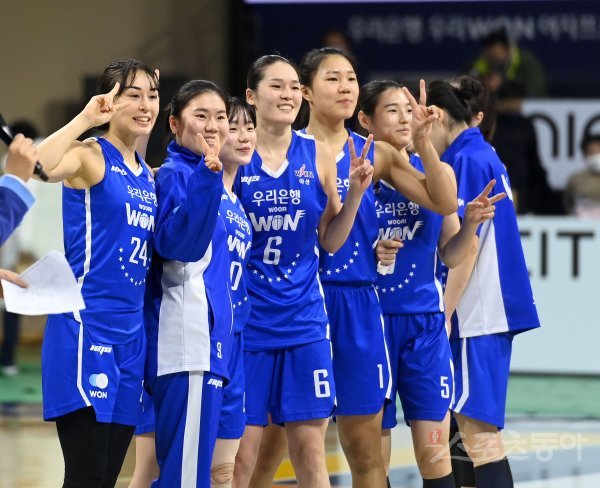 13일 아산 이순신체육관에서 열린 ‘삼성생명 2021~22 여자프로농구’ 우리은행과 BNK 썸 경기에서 우리카드가 78-59 승리를 거두며 2연패에서 탈출했다. 김소니아와 선수들이 기념촬영을 하고 있다. 아산 | 김종원 기자 won@donga.com