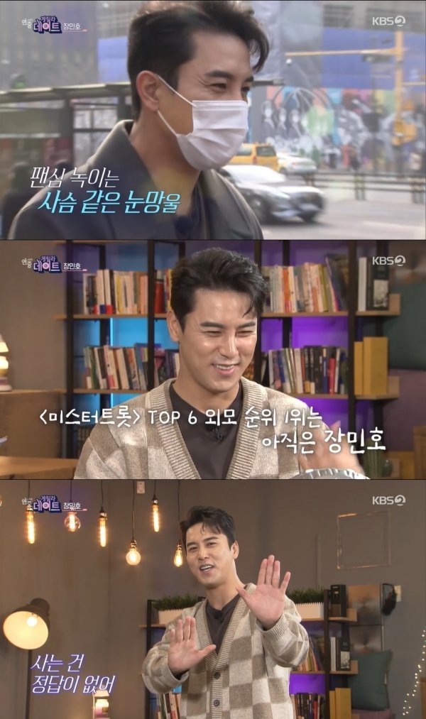 이날 장민호는 강남 거리에 깜짝 등장해 팬들을 놀라게 했다. 데뷔 25년 만에 ‘게릴라 데이트’에 출연한 장민호는 “너무 기쁜 마음으로 왔다”라며 “오늘 팬들이 원하는 건 다 할 수 있다. 뽀뽀도 가능하다”고 말해 기대를 높였다.