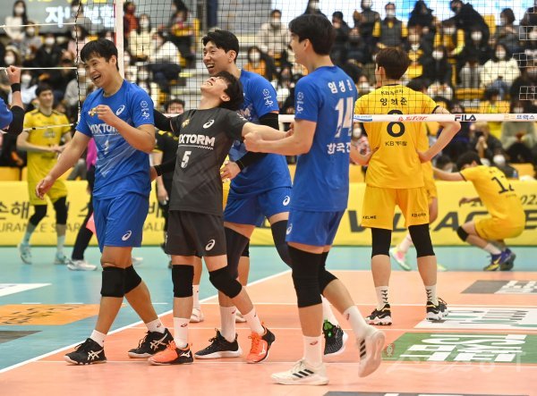 16일 의정부체육관에서 열린 ‘2021~2022 도드람 V-리그’ 남자부 KB손해보험과 한국전력 경기에서 세트스코어 3-2 역전승을 거두며 3연패에서 탈출한 한국전력 선수들이 기뻐하고 있다.