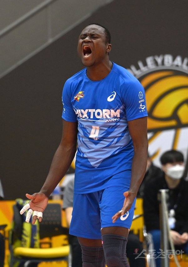 16일 의정부체육관에서 열린 ‘2021~2022 도드람 V-리그’ 남자부 KB손해보험과 한국전력 경기에서 한국전력 다우디가 공격 득점에 성공한 후 환호하고 있다.