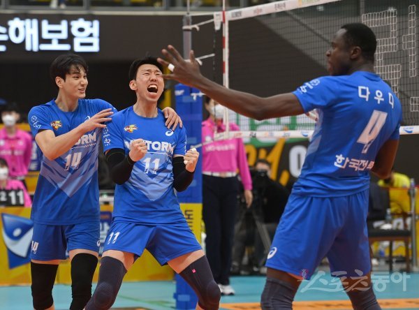 16일 의정부체육관에서 열린 ‘2021~2022 도드람 V-리그’ 남자부 KB손해보험과 한국전력 경기에서 한국전력 다우디가 공격 득점에 성공한 후 조근호와 환호하고 있다.
