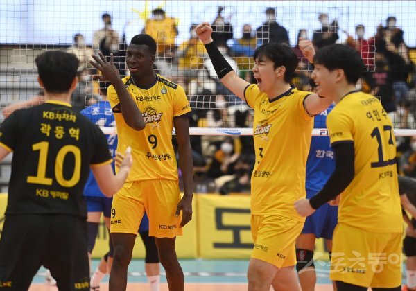 16일 의정부체육관에서 열린 ‘2021~2022 도드람 V-리그’ 남자부 KB손해보험과 한국전력 경기에서 KB손해보험 케이타가 공격 득점에 성공한 후 기뻐하고 있다.