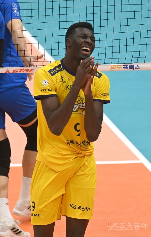 16일 의정부체육관에서 열린 ‘2021~2022 도드람 V-리그’ 남자부 KB손해보험과 한국전력 경기에서 KB손해보험 케이타가 공격에 실패한 후 아쉬워하고 있다.