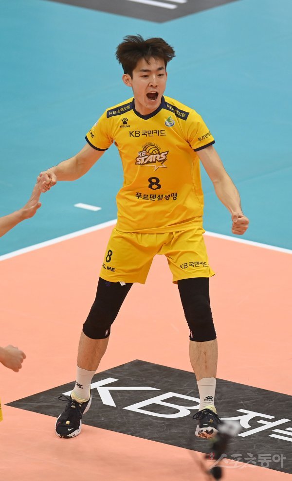 16일 의정부체육관에서 열린 ‘2021~2022 도드람 V-리그’ 남자부 KB손해보험과 한국전력 경기에서 KB손해보험 양희준이 서브 득점에 성공한 후 기뻐하고 있다.