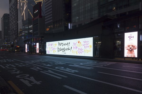 도심 한복판의 건조한 장소였던 스마트쉘터 버스정류소가 디지털 디스플레이를 활용하여 멋진 전시 공간을 구현해내고 있다.
