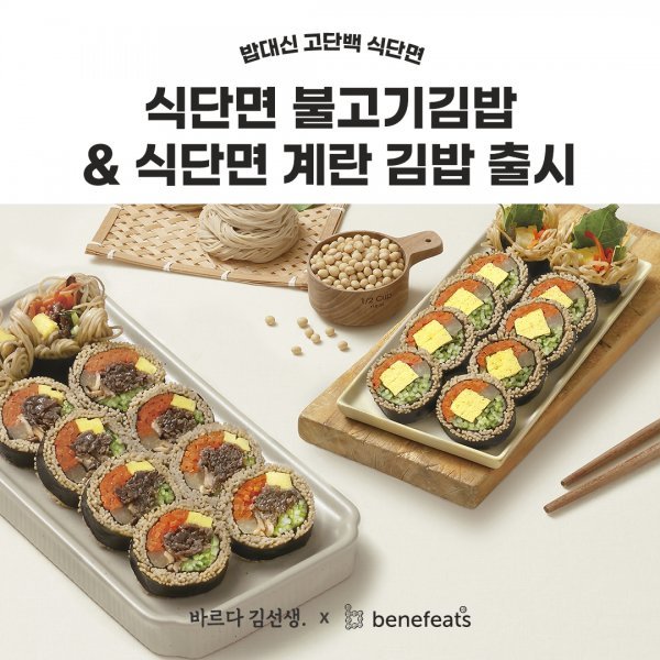 베네핏츠는 10일 바른 먹거리를 위해 프리미엄 브랜드 바르다 김선생과 협약을 맺고 건강한 식단 개발및 보급을 밝혔다. 그 프로젝트 첫 번째로 출시된 ‘식단면김밥 2종’은 밥 대신Non-GMO 대두로 만든 건강한 식단면 생면으로 만든 김밥이다. 불고기 김밥과 계란 김밥총 2가지 맛으로 출시했으며, 고단백 고식이섬유 식단면과 맛있는 불고기, 영양가 높은 계란이 만나 맛과 영양 두 가지를 모두 충족시킨 메뉴다. 식단면 불고기 김밥과 계란 김밥은 용산구 이촌동 이촌 직영점을 비롯해 전국 바르다 김선생 매장에서 만날 수 있다.