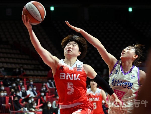 17일 부산 사직실내체육관에서 열린 ‘삼성생명 2021-2022 여자프로농구’ 부산 BNK썸과 용인 삼성생명의 경기에서 BNK썸 안혜지가 삼성생명 이주연의 수비를 피해 슛을 쏘고 있다.